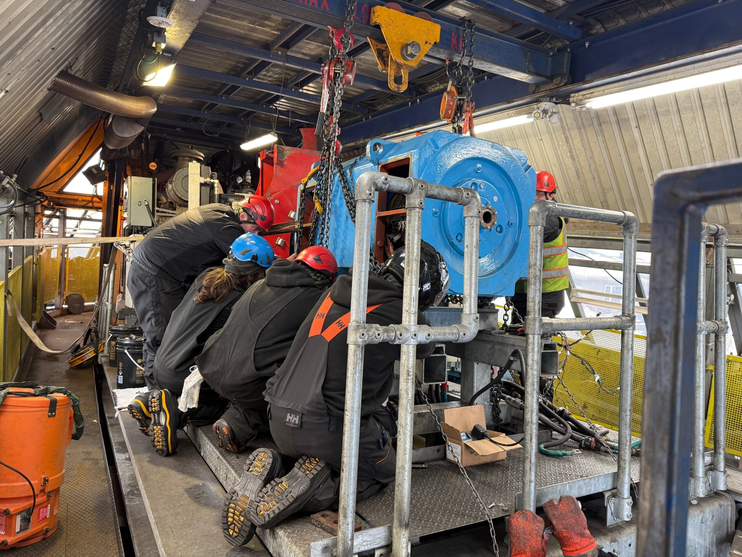 Le moteur de remplacement est maintenant en place et plusieurs préparatifs ont été réalisés, dont le branchement électrique. Les techniciens de notre sous‑traitant spécialisé ont toutefois éprouvé des difficultés à transférer la grande roue d’inertie d’un moteur à l’autre. Ils sont de retour ce matin avec l’équipement nécessaire pour compléter cette étape, et nous espérons pouvoir faire tourner la remontée à vide en après‑midi.