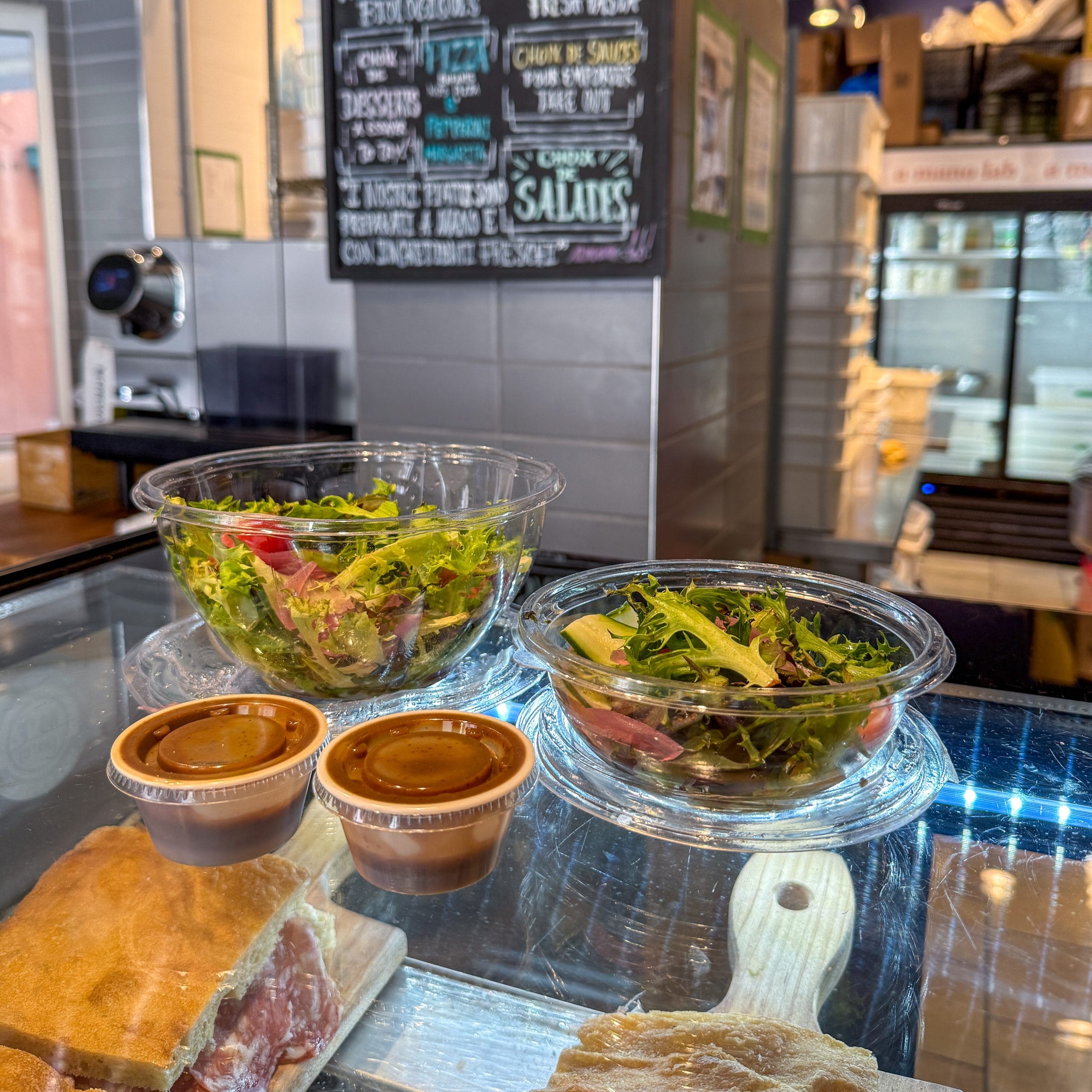 Le comptoir à emporter au restaurant A Mano dans la Rue des Remparts offre, entre autres, des salades vertes prêtes à manger et servies avec une vinaigrette balsamique, idéal pour un repas sur le pouce entre deux activités. Le tout préparé fraîchement chaque jour par leur équipe.