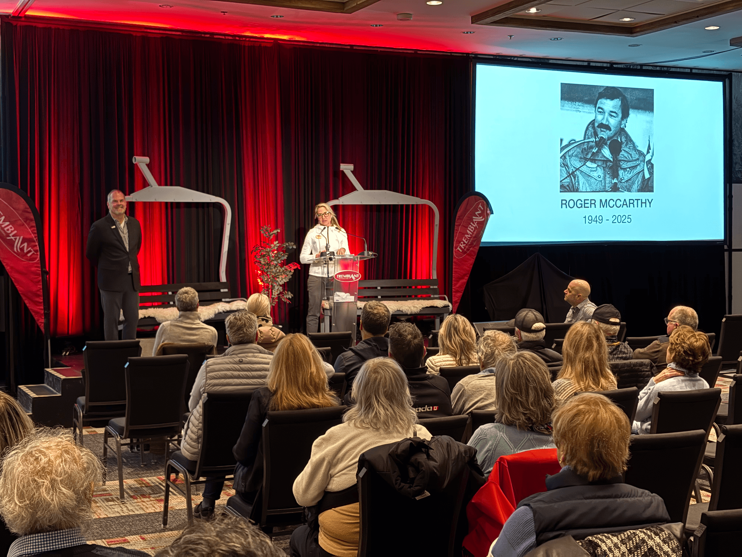 After the passing of Roger McCarthy on January 4, 2025, the Tremblant community gathered at Camp de Base on Saturday, April 5, 2025, to pay tribute to a towering figure in the ski industry. Nearly 150 people came together to honour the impressive legacy of a man who helped shape Tremblant into the mountain destination it is today. The ceremony was hosted with heartfelt emotion and sincerity by Yves Juneau, President and CEO of the Quebec Ski Areas Association and founding board member of the Fondation Tremblant, and Annique Aird, Vice President of Sales, Marketing and Communications at Station Mont Tremblant.