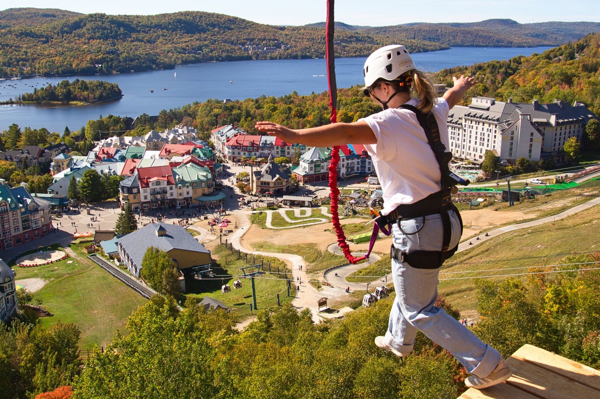 A brand-new experience launching May 8. The Jump Zone offers a controlled leap from the final Ziptrek Écotours viewing platform, with breathtaking views over the pedestrian village and Lake Tremblant.